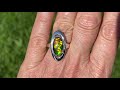 This Korite Brand ring has a genuine oval shape ammolite that measures 17x10mm and is set in 925 sterling silver. The sterling silver metal surrounding the stone measures 1 inch long. You receive this exact Korite ring.